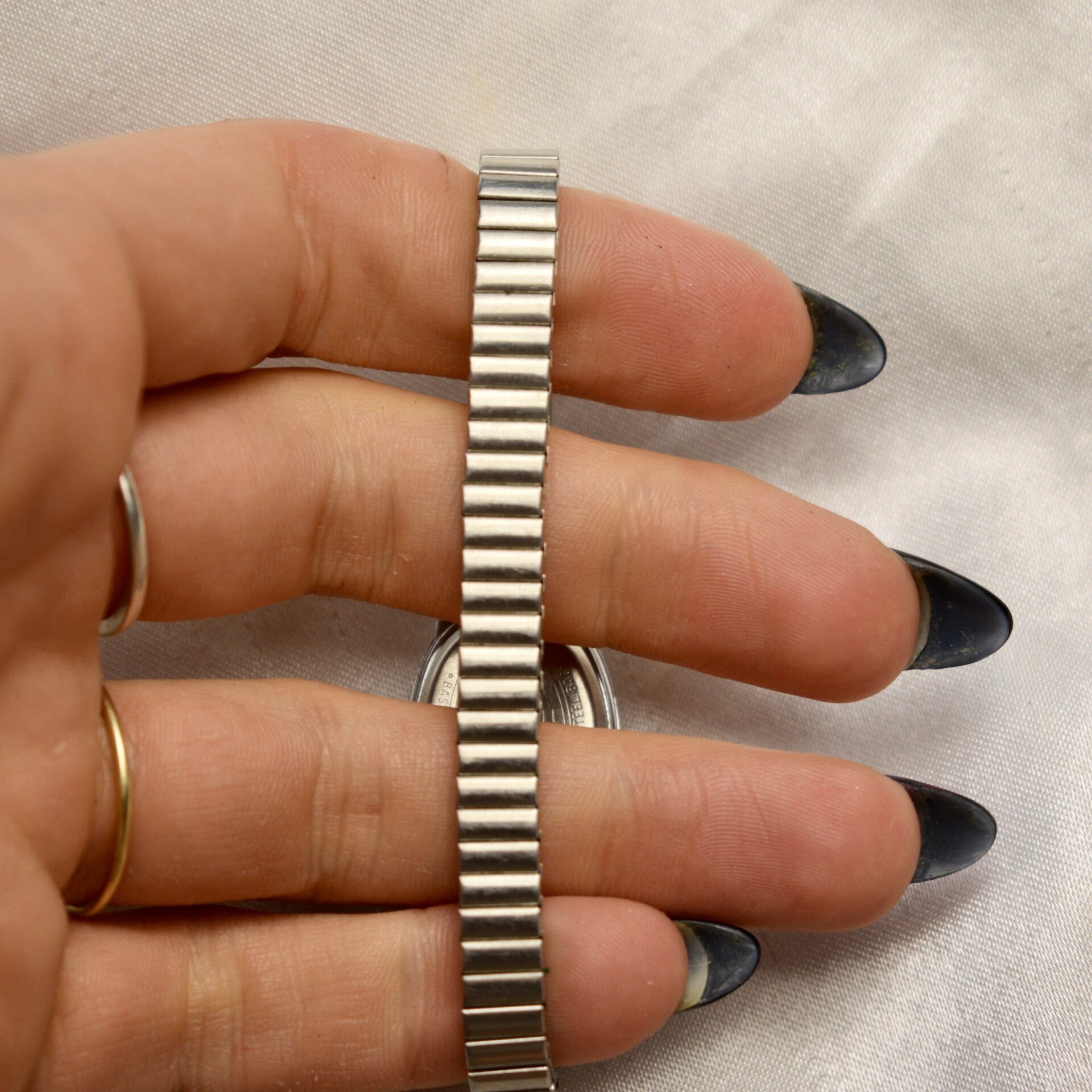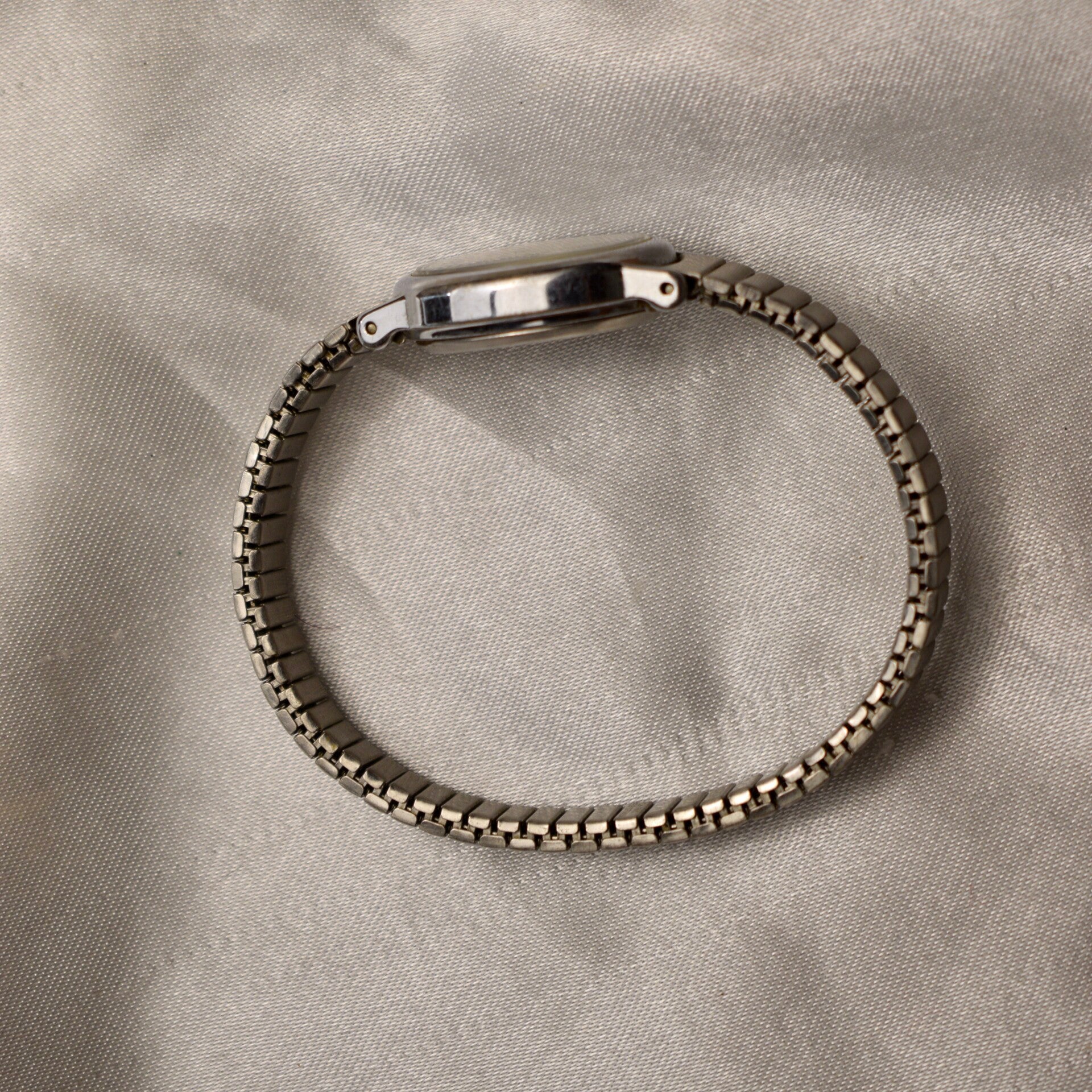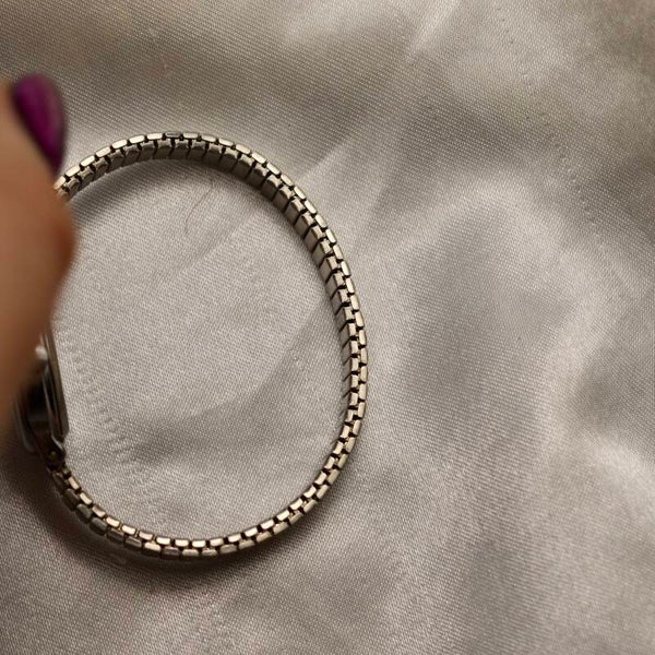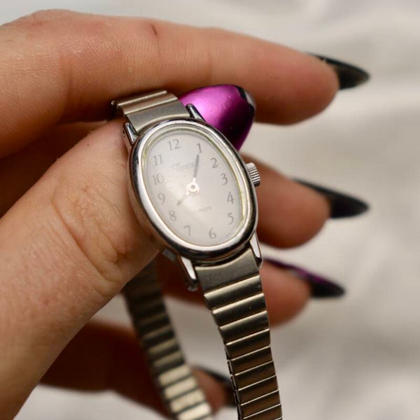 Women’s Timex dainty silver toned stretch band style watch.