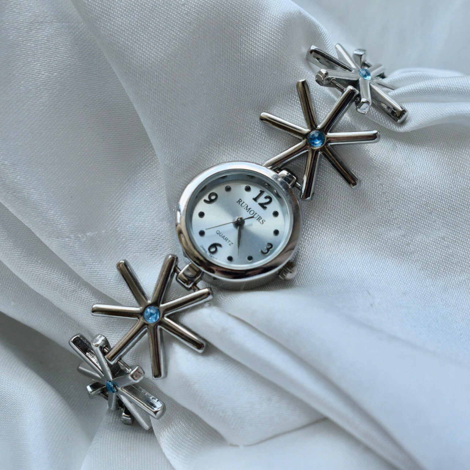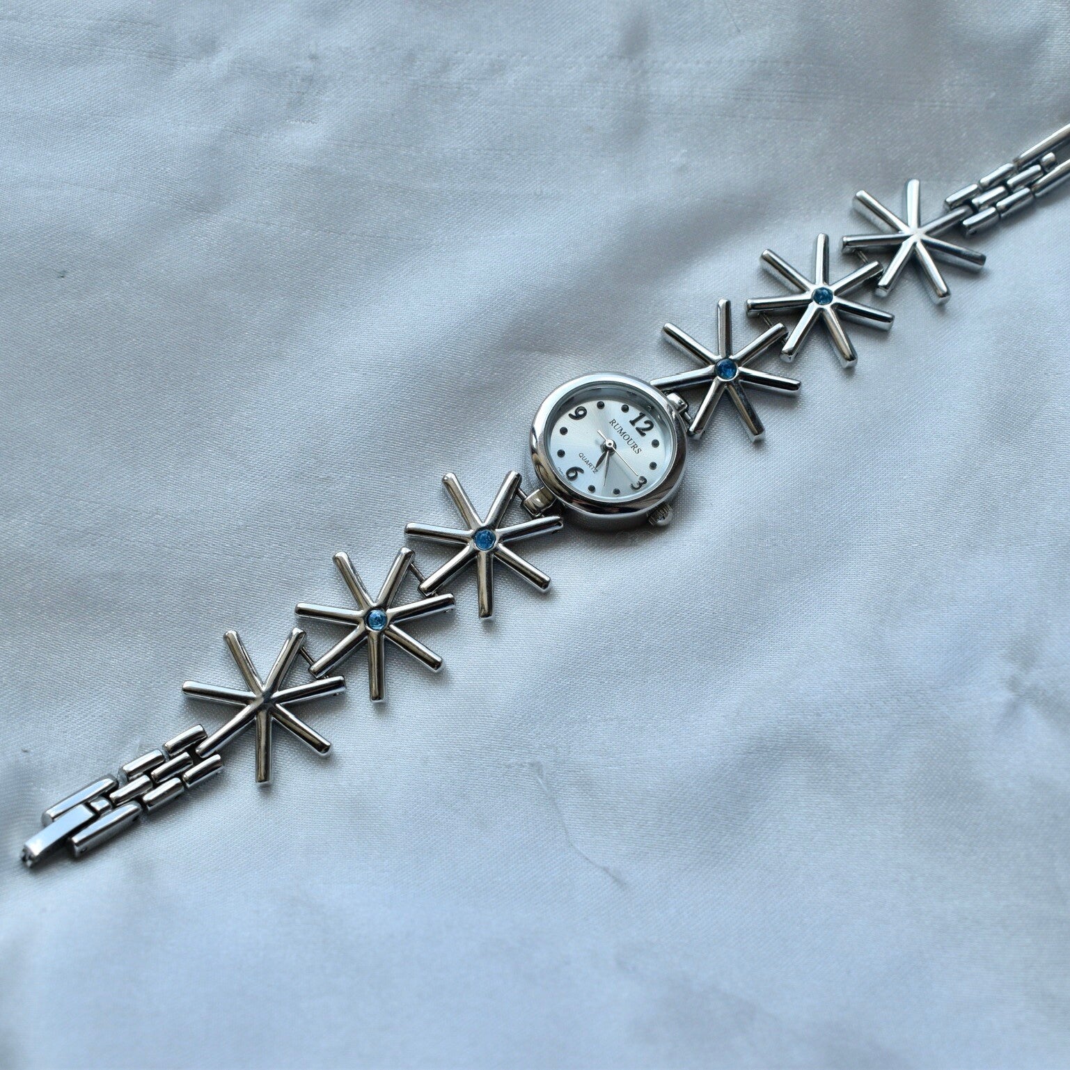 Women’s Rumours silver toned clasp band style watch with silver snowflakes with blue stones along the band.