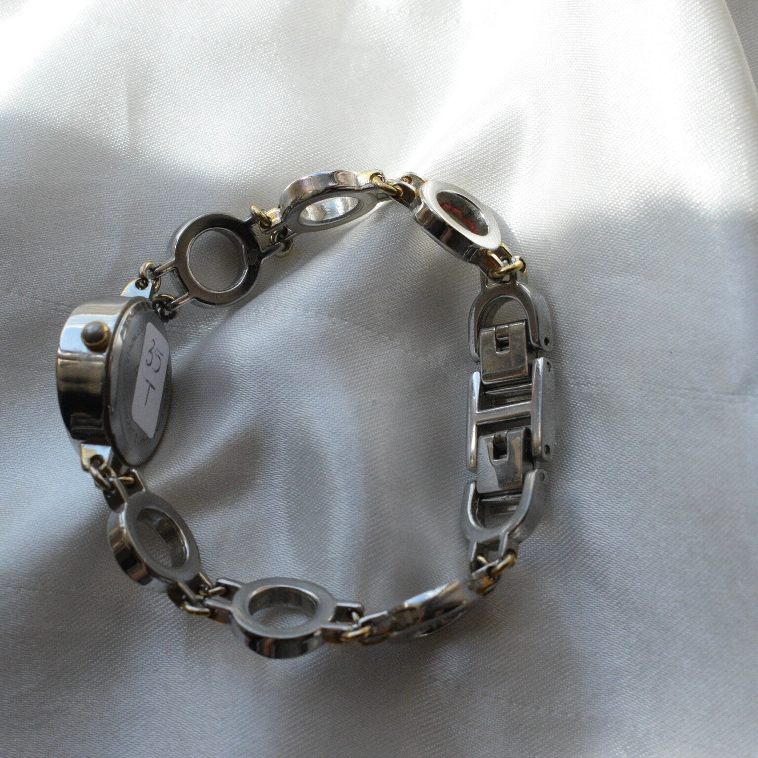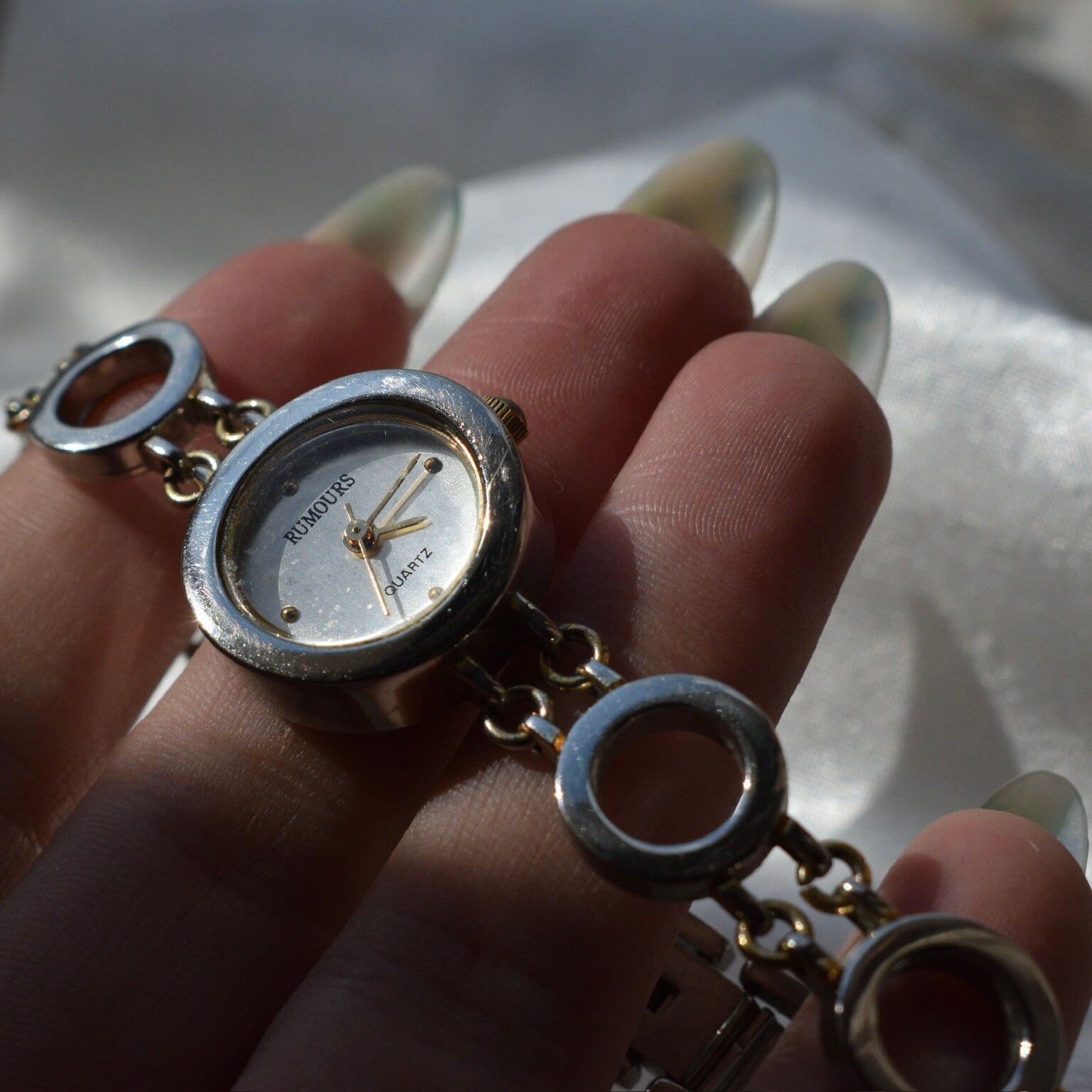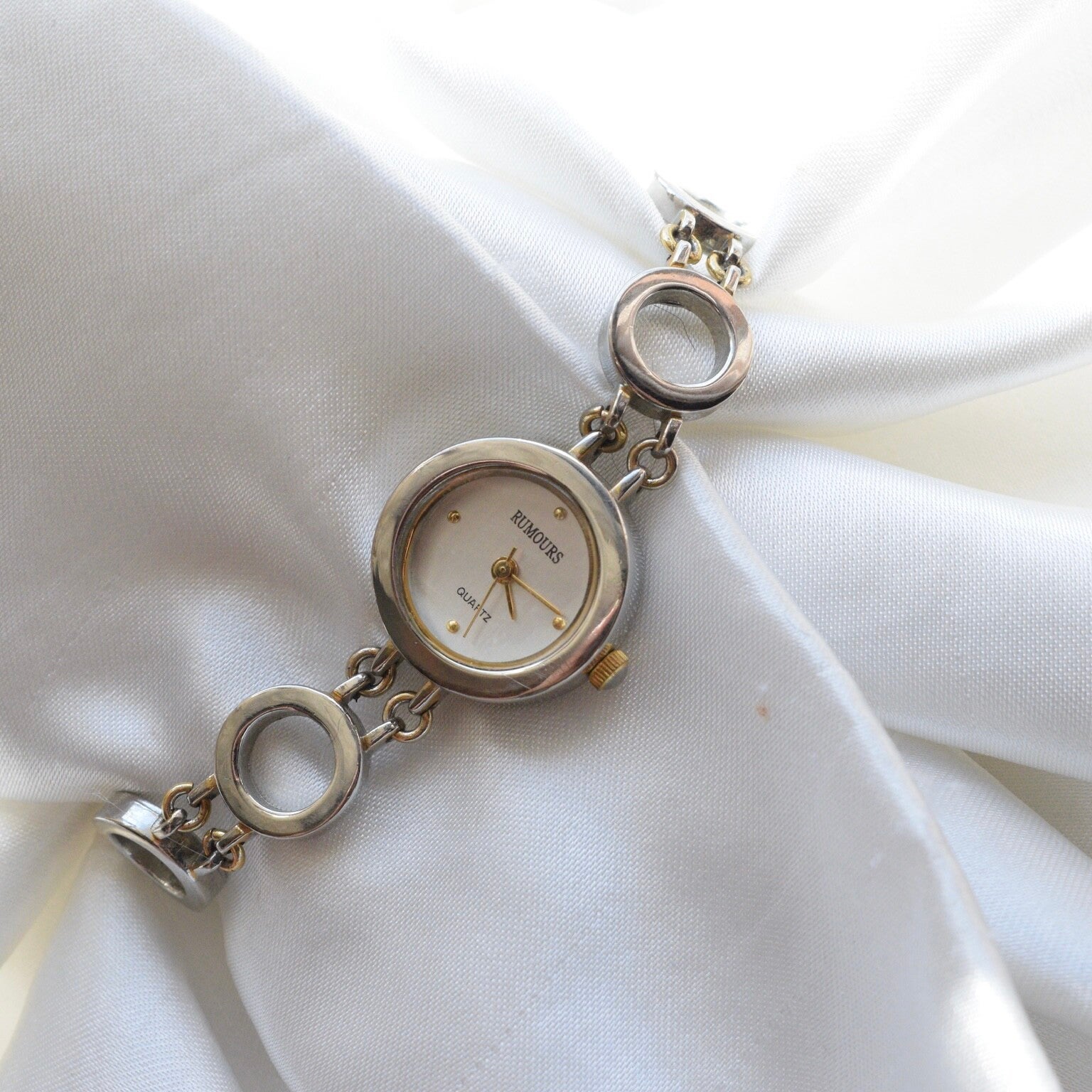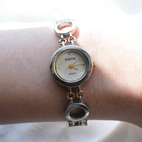 Silver mother of pearl rectangular face with gold numbers and gold hands