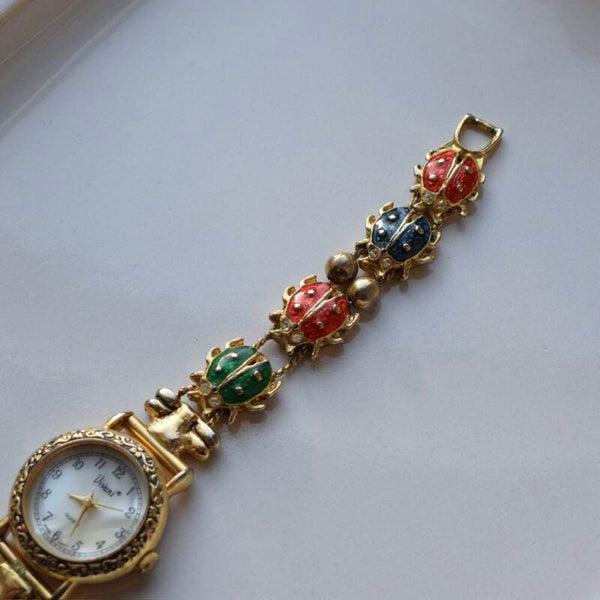 Women’s Vivani gold toned clasp band style watch with green and red lady bugs along the band.