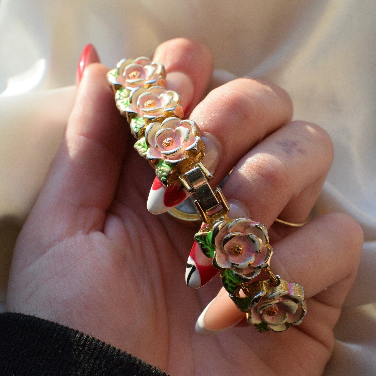 Women’s Ariandne gold toned clasp band style watch with pink and green flowers along the band.