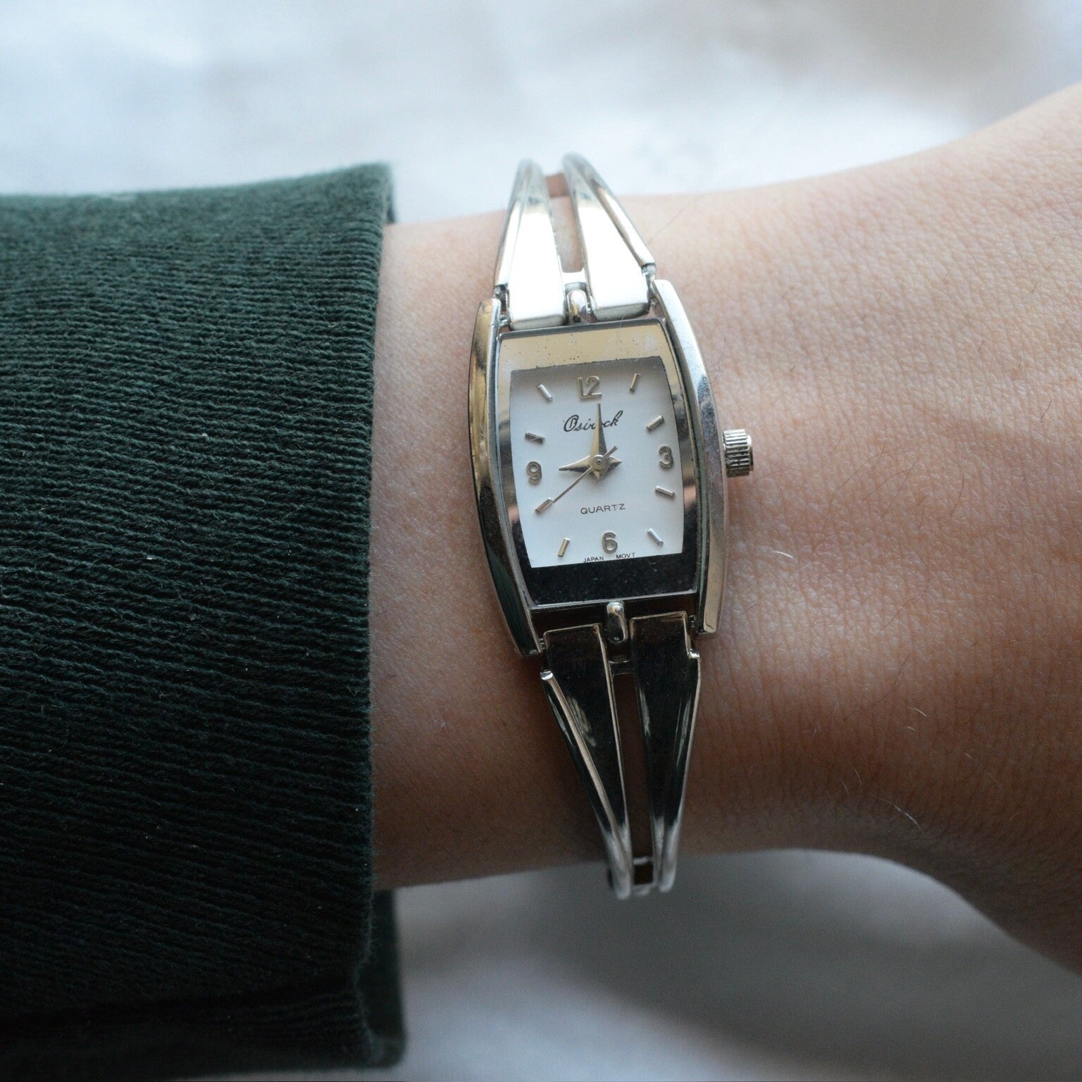 white rectangular face with silver numbers and silver hands.